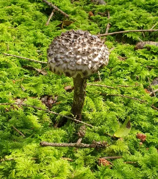Der Stiel ist dunkel graubraun und mit sparrigen Schuppen besetzt.