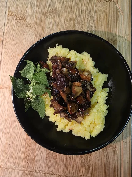 500 g Kartoffeln 5 g Safran 100 g Sahne 100 g Milch 30 g Butter 400 g Pilze, gemischt (z. B. Champignons, Samtfußrüblinge) 2 Knoblauchzehen Salz und Pfeffer 30 g Balsamico 15 g Honig
